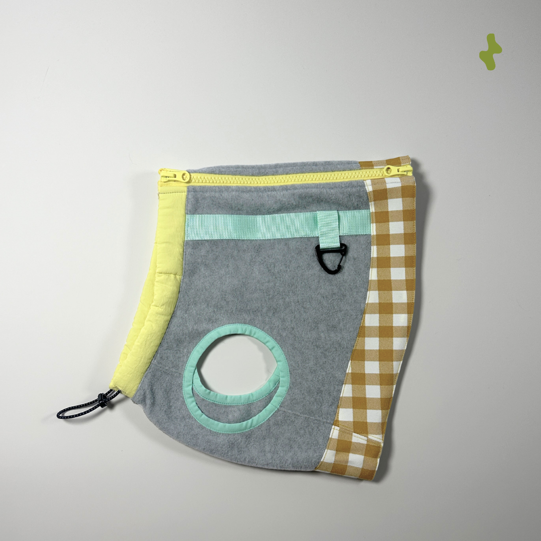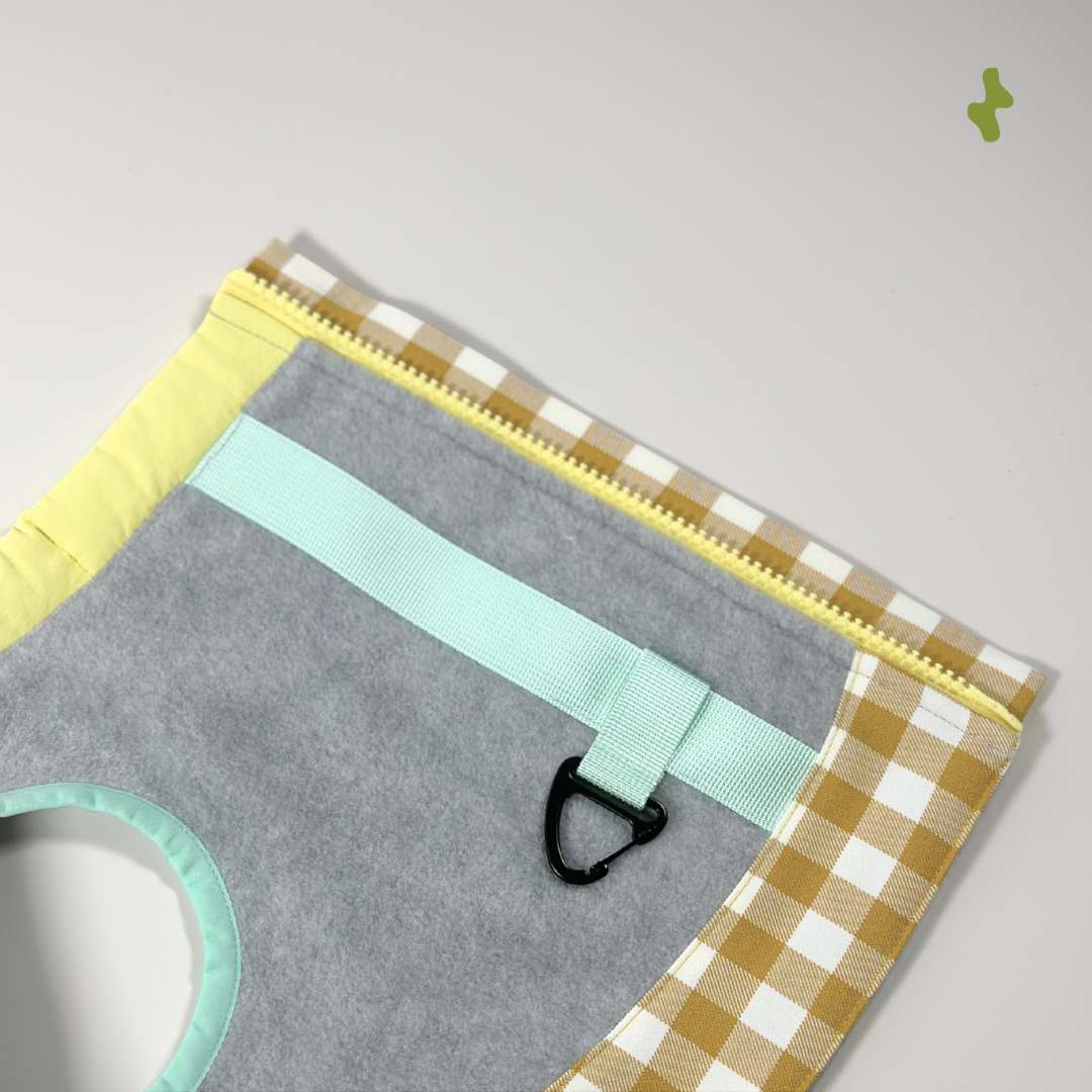 Functional and fashionable vest designed to keep your furry pet warm. Crafted from premium grey Japan-imported fleece, the vest is elevated by the classic yellow gingham checks and a distinct mint green piping detail.