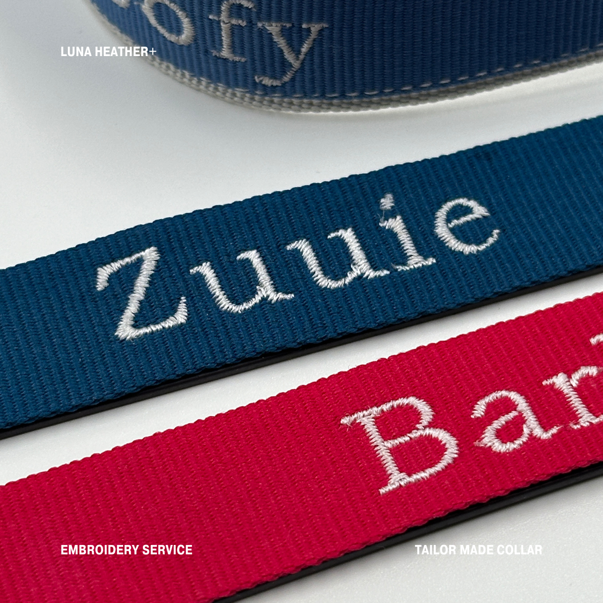 此刺繡帶是一個專為Luna Heather+ 頸巾設計的配件,刺繡帶上配備啪鈕,可以輕鬆扣上Luna Heather+頸巾。寵物主人亦可以自由選擇刺繡帶的顏色搭配和想刺繡的名。